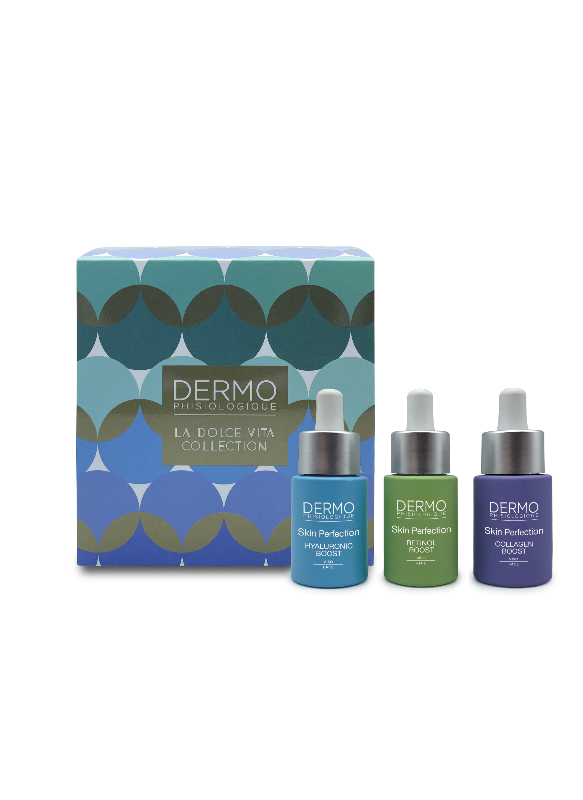 Cofanetto Skin Perfection Trilogy: COLLAGEN BOOST: AQUA, GLYCERIN, SODIUM LACTATE, PALMITOYL TRIPEPTIDE-5, PALMITOYL DIPEPTIDE-5 DIAMINOBUTYROYL HYDROXYTHREONINE, TETRADECYL AMINOBUTYROYLVALYLAMINOBUTYRIC UREA TRIFLUOROACETATE, SODIUM HYALURONATE, XANTHAN GUM, MAGNESIUM CHLORIDE, SODIUM HYDROXIDE, LACTIC ACID, ETHYLHEXYLGLYCERIN, PHENOXYETHANOL.