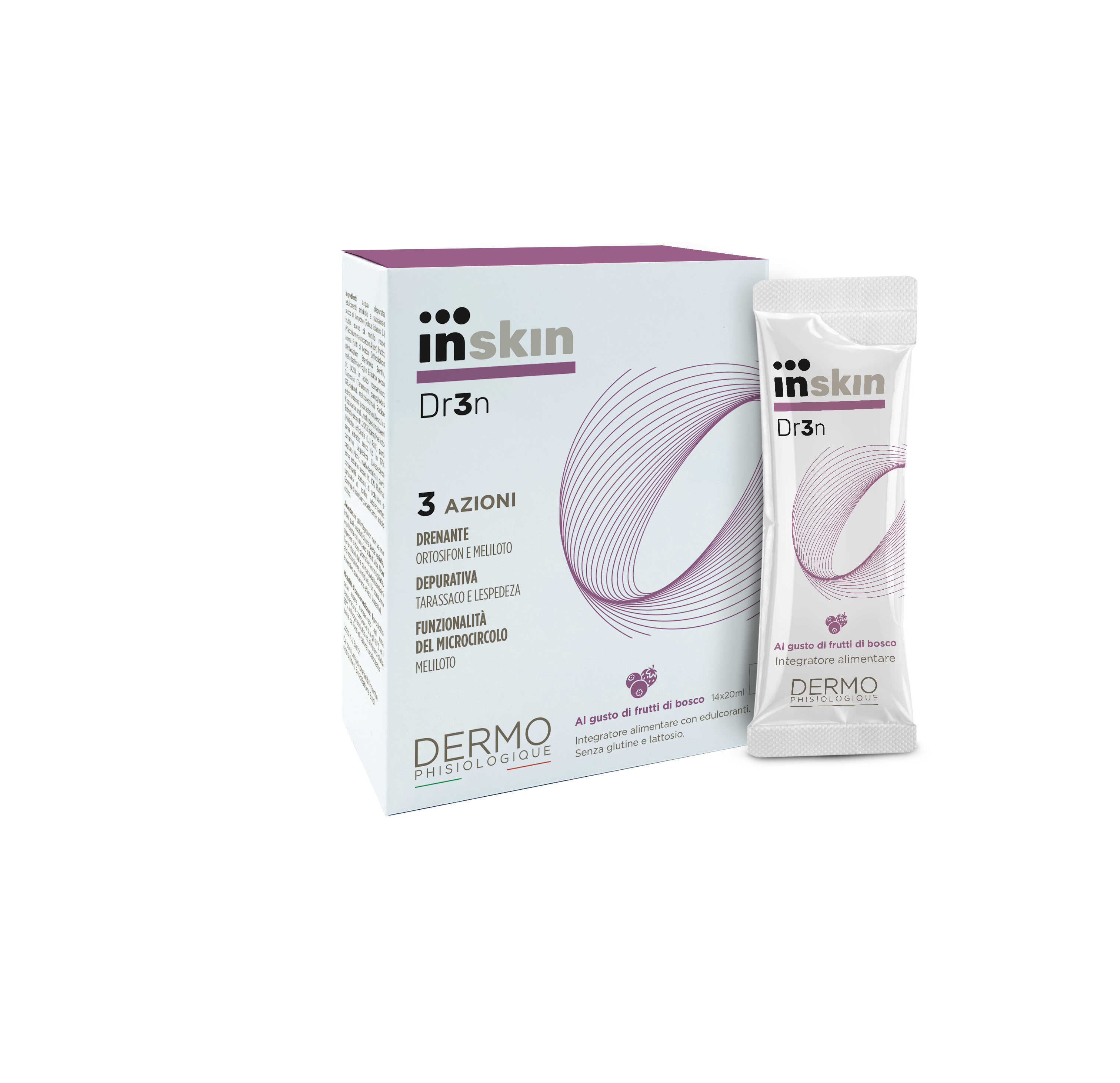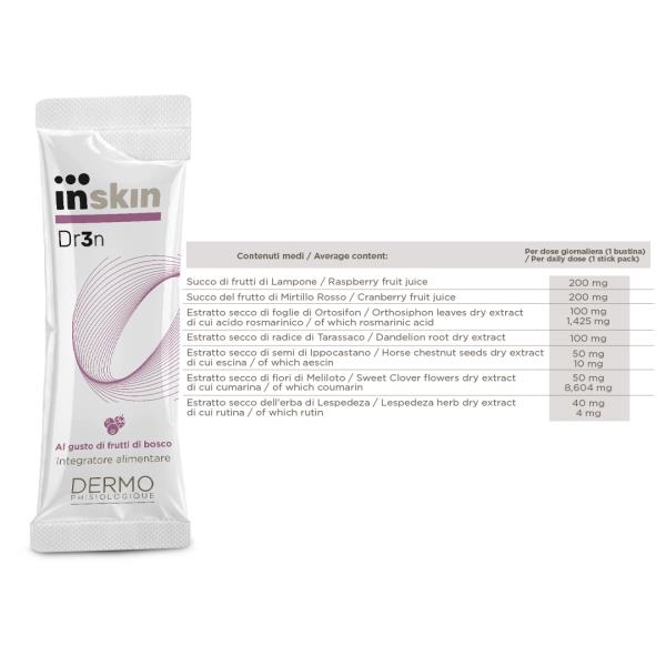 INSKIN Dr3n è l’integratore alimentare Dermophisiologique, dal gradevole sapore di frutti di bosco, a base di estratti vegetali titolati quali Ortosifon, Meliloto, Tarassaco, Lespedeza e Ippocastano ideale per per favorire il drenaggio dei liquidi corporei (ortosifon e meliloto) la depurazione dell'organismo (tarassaco e lespedeza) e la funzionalità del microcircolo (meliloto).