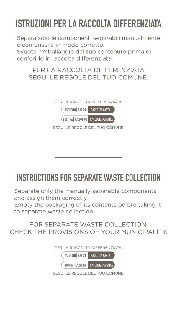Modalità di conservazione: il prodotto deve essere conservato ad una temperatura compresa tra gli 8°C e i 25°C, in luogo asciutto ed al riparo dalla luce e da fonti di calore localizzato.