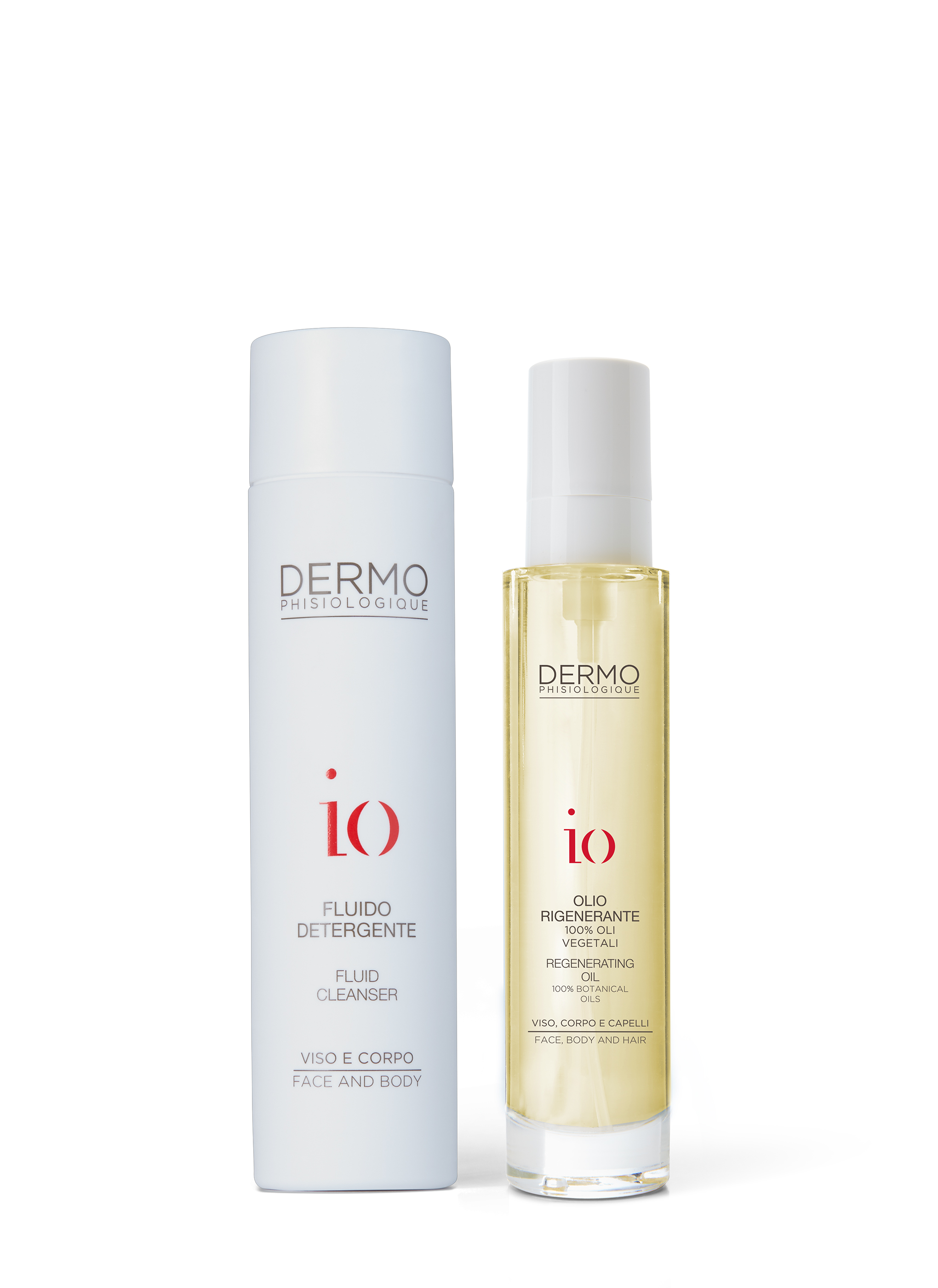 La routine di detersione e trattamento con il nuovo IO Fluido Detergente e IO Olio Rigenerante e per una pelle morbida, nutrita e avvolta dall’inconfondibile profumo della linea IO.